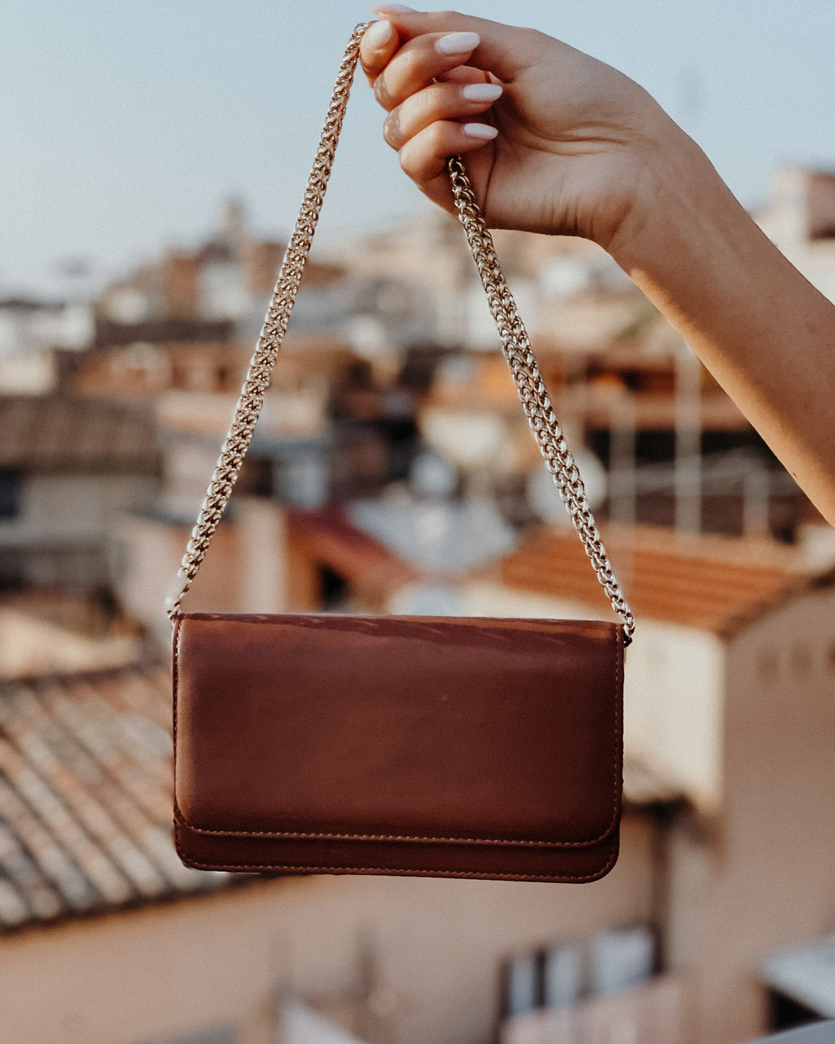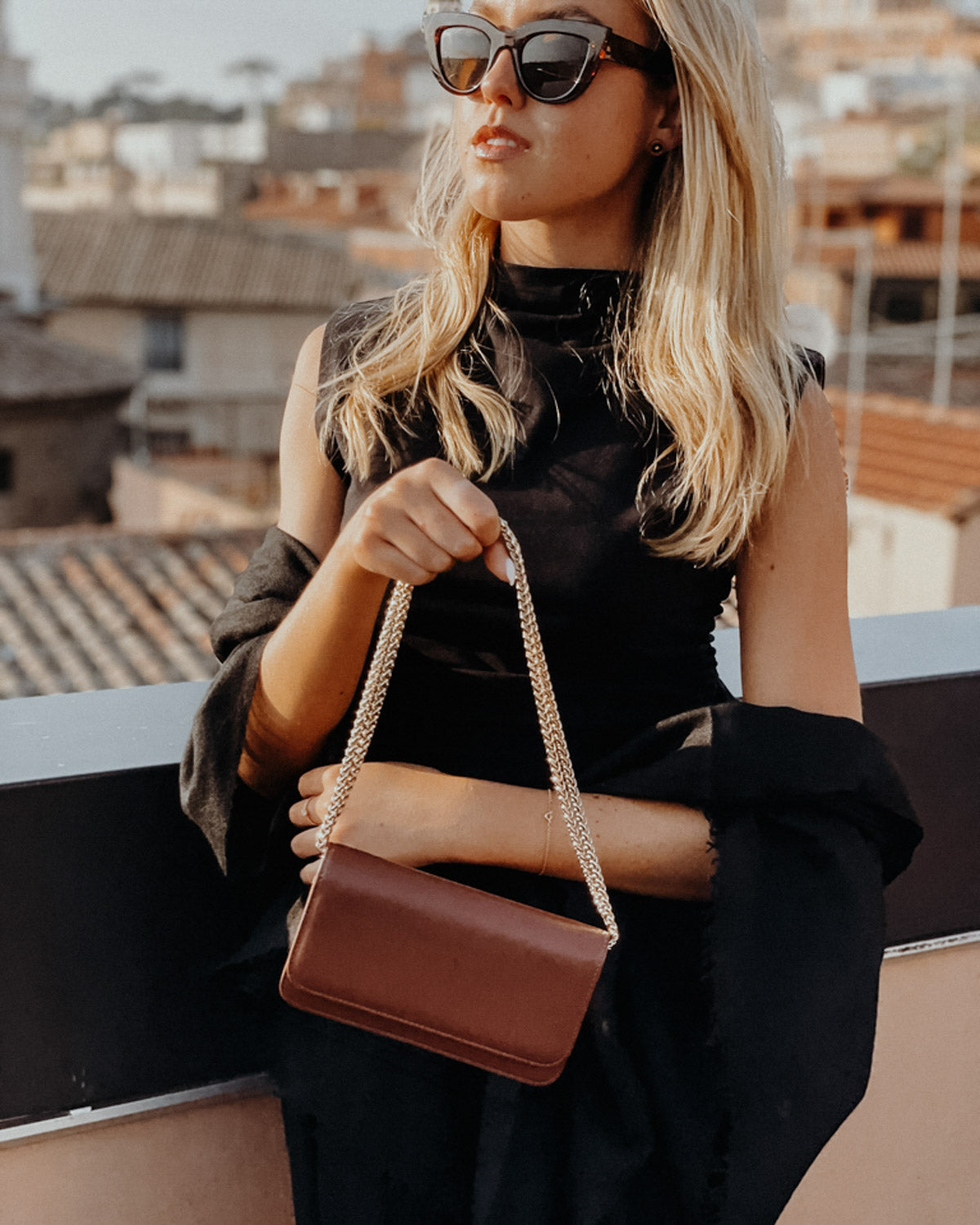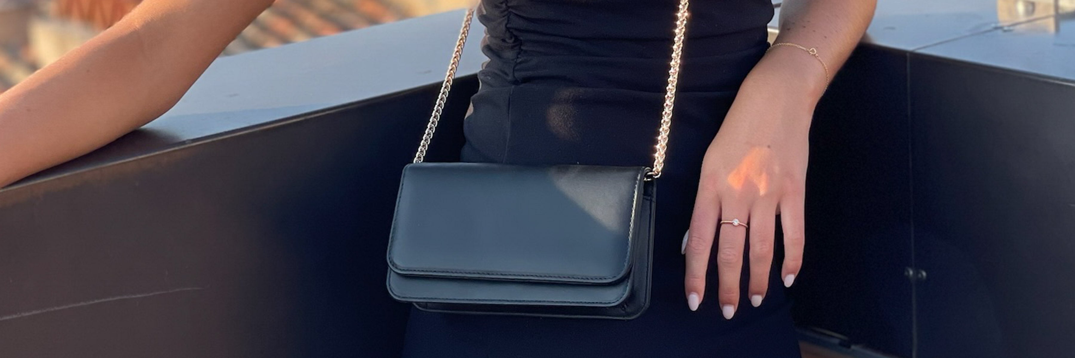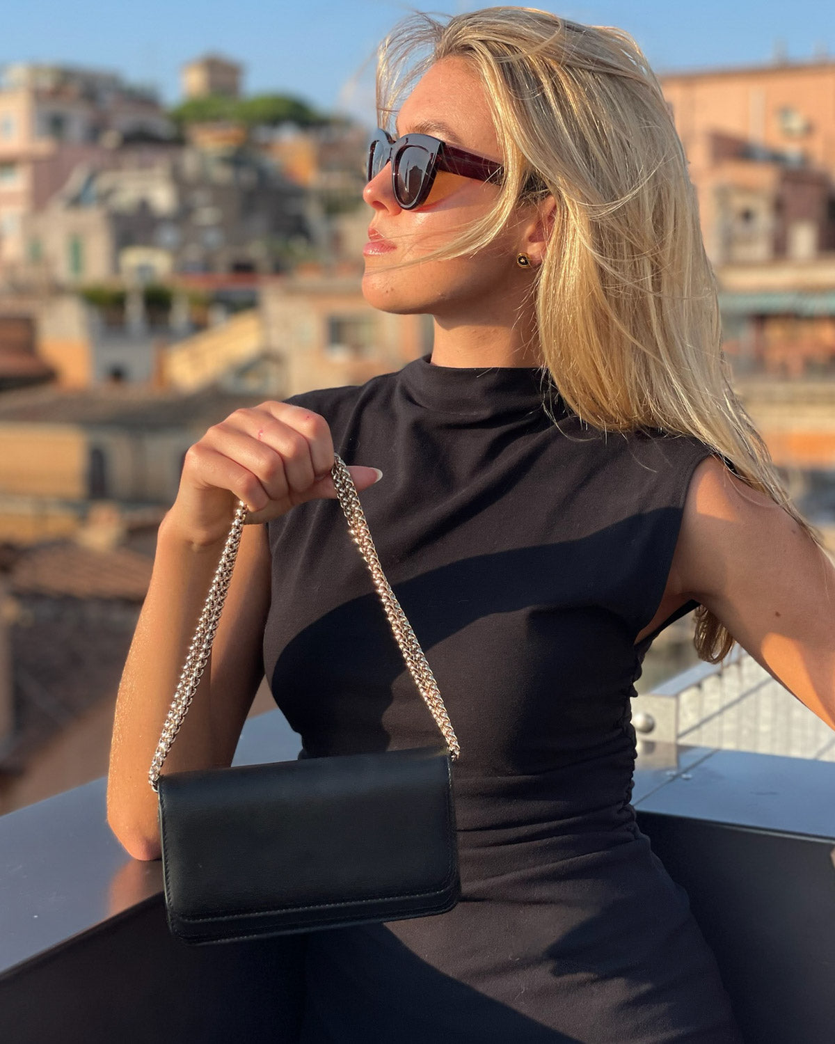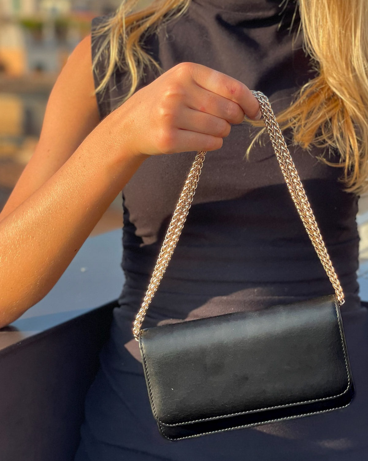 This streamlined elegant crossbody bag has been handcrafted in Italy from the finest quality leather. The adjustable chain strap can be worn cross-body or doubled-up on the shoulder. Accompanying cardholder included inside.