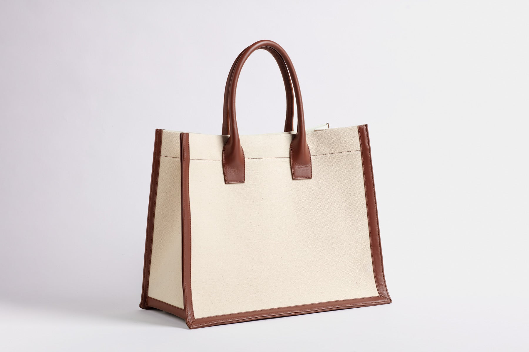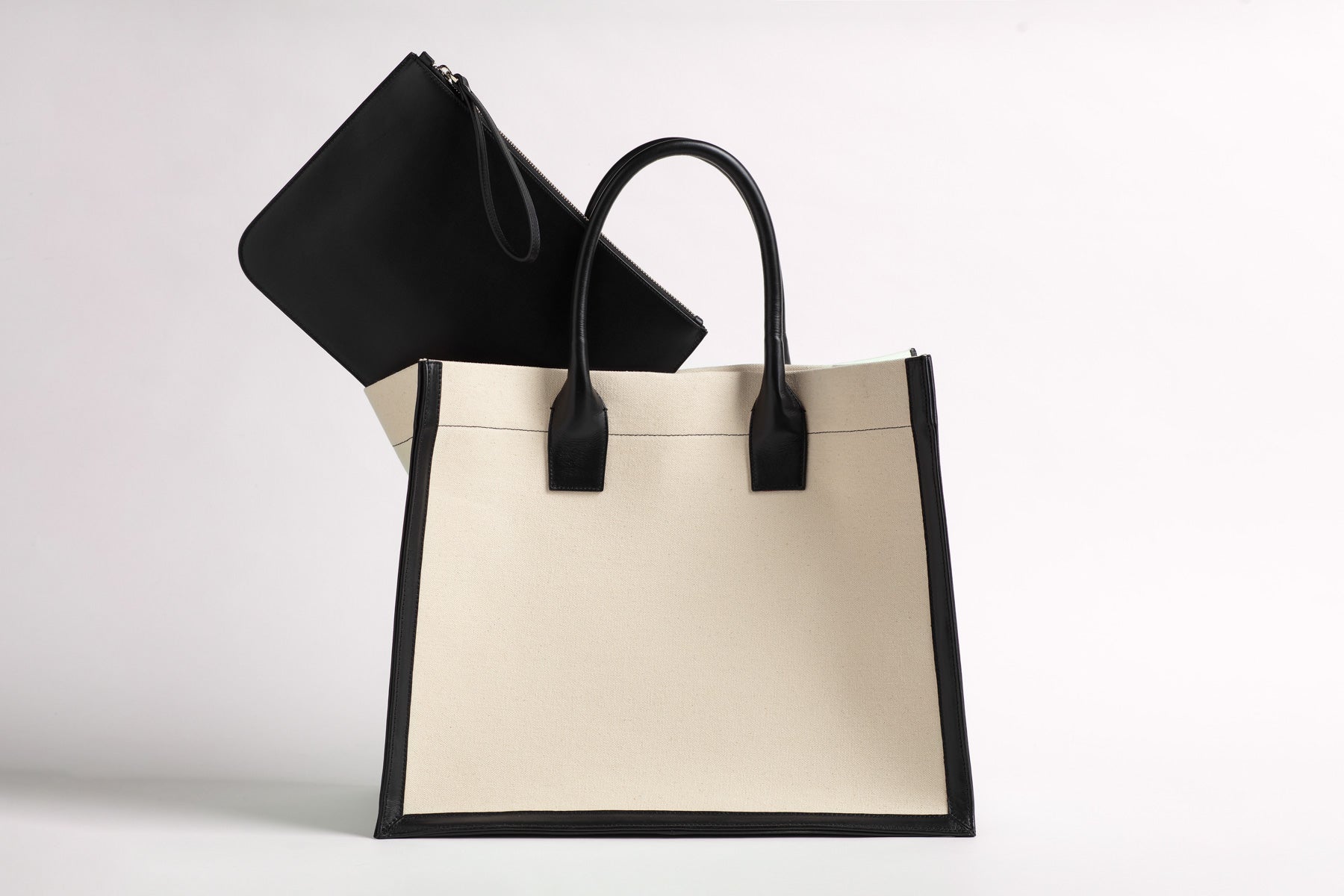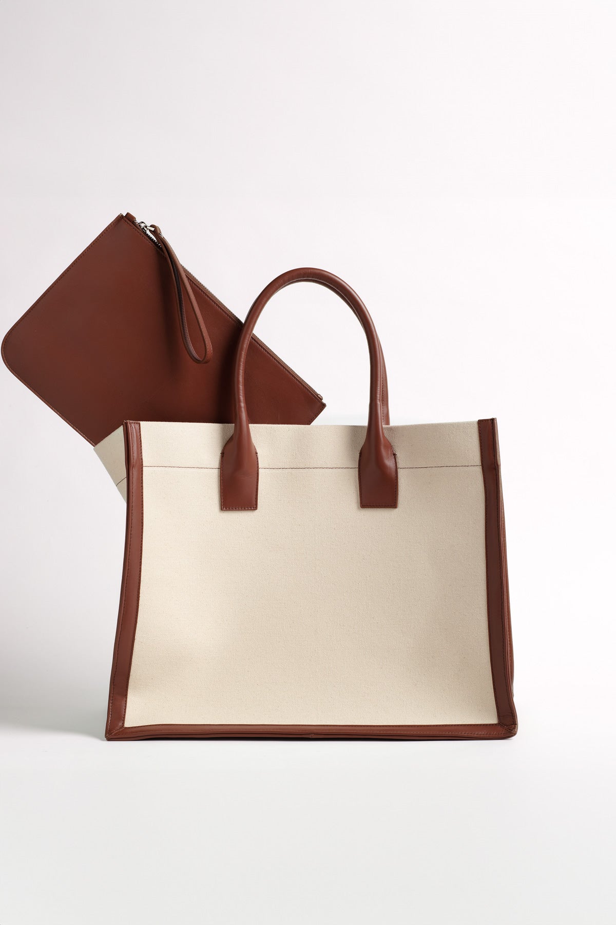 The spacious and versatile Portofino Tote is crafted in Italy from canvas with contrasting nappa leather trim. It includes a coordinating Portofino clutch for your valuables, which has a cardholder-style wallet interior. Its generously proportioned design includes interior pockets, with ample room for a laptop, cashmere and other essentials, this timeless structured tote offers a perfect blend of style and functionality.
