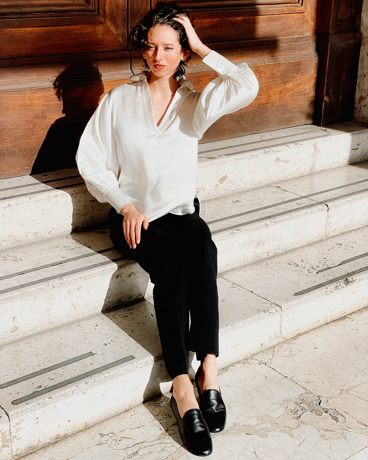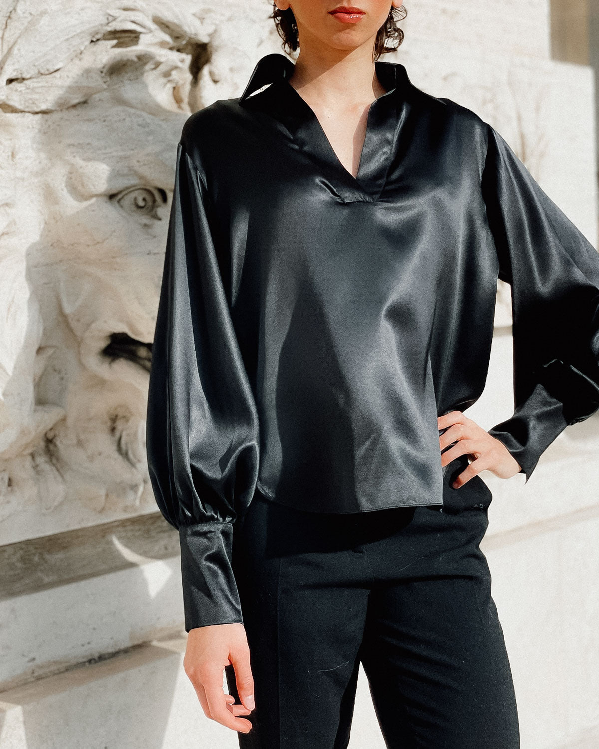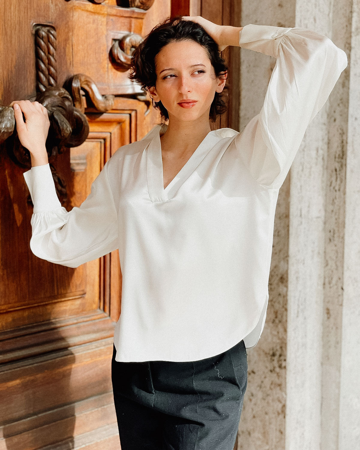 Fluid and refined, the Sabina Silk Blouse is crafted in Italy from lustrous silk with a natural drape. Designed with a softly structured neckline and graceful sleeve detail, it offers understated elegance from day to evening.
