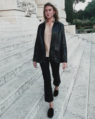 Defined by understated sophistication, the Tevere Jacket in supple black nappa leather carries a relaxed, urban ease. A versatile layer that moves seamlessly from city to travel.