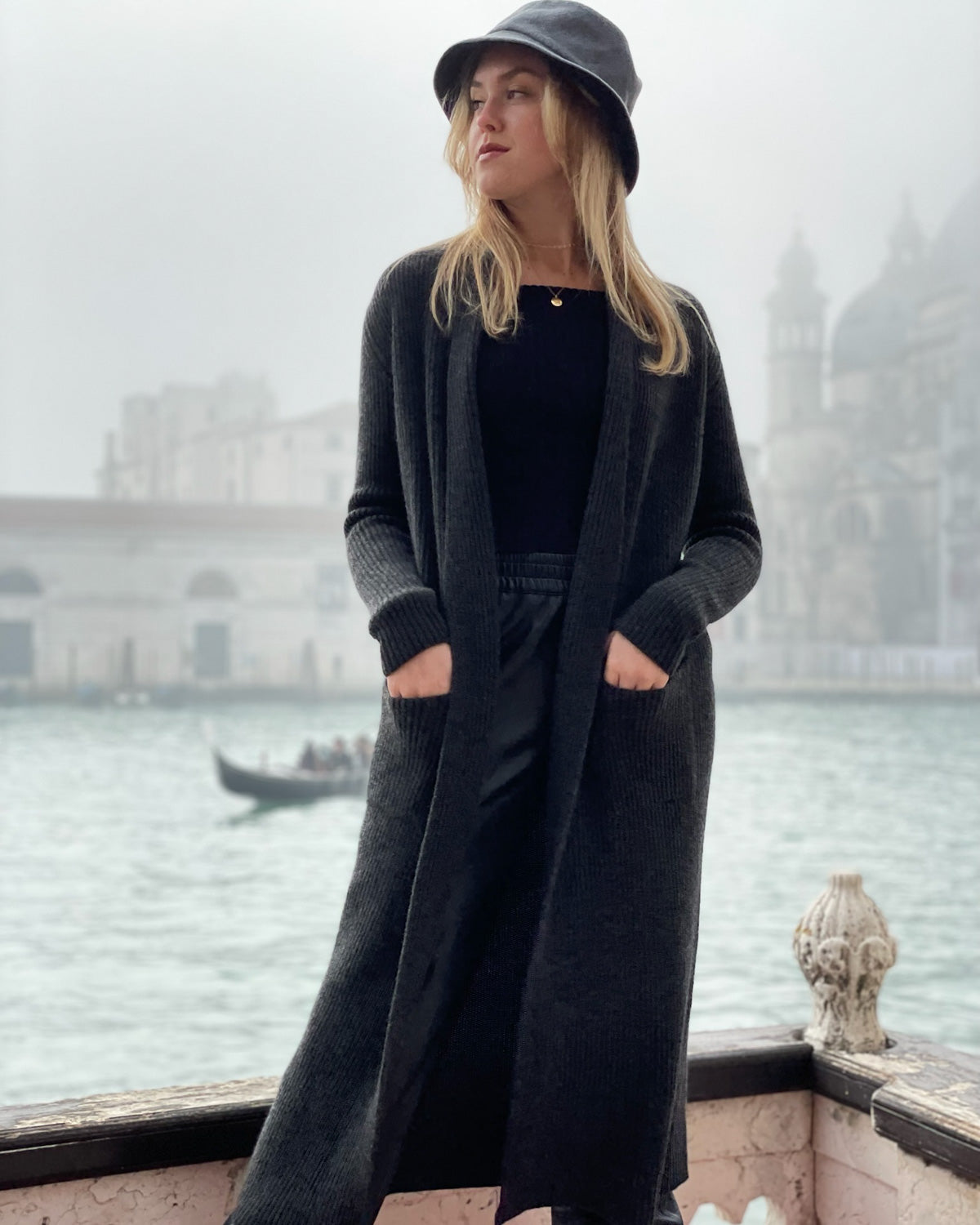 Knit from the finest 100% cashmere, the Venezia Robe offers warmth and an indulgently soft hand, a piece to live in from morning to night. Its sumptuous 8-ply ribbed knit envelops the body in soft warmth while maintaining a fluid, elongated silhouette. Designed as a modern duster or luxe robe, it features deep front pockets and cashmere belt, a clean minimalist line.